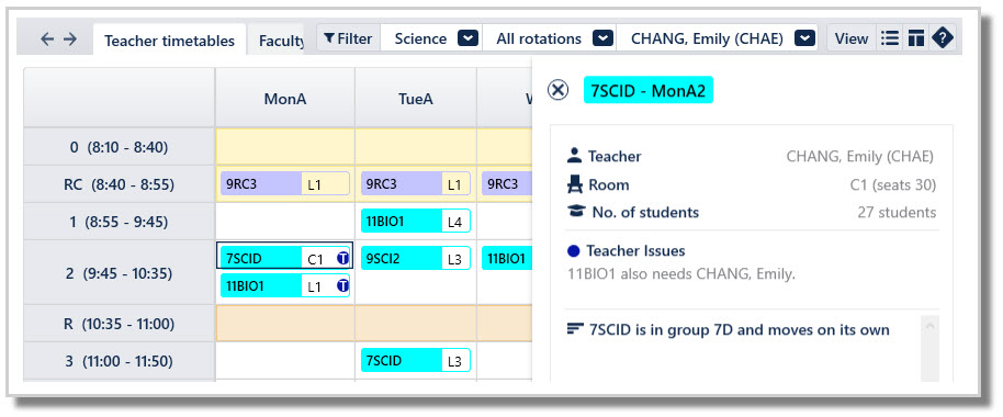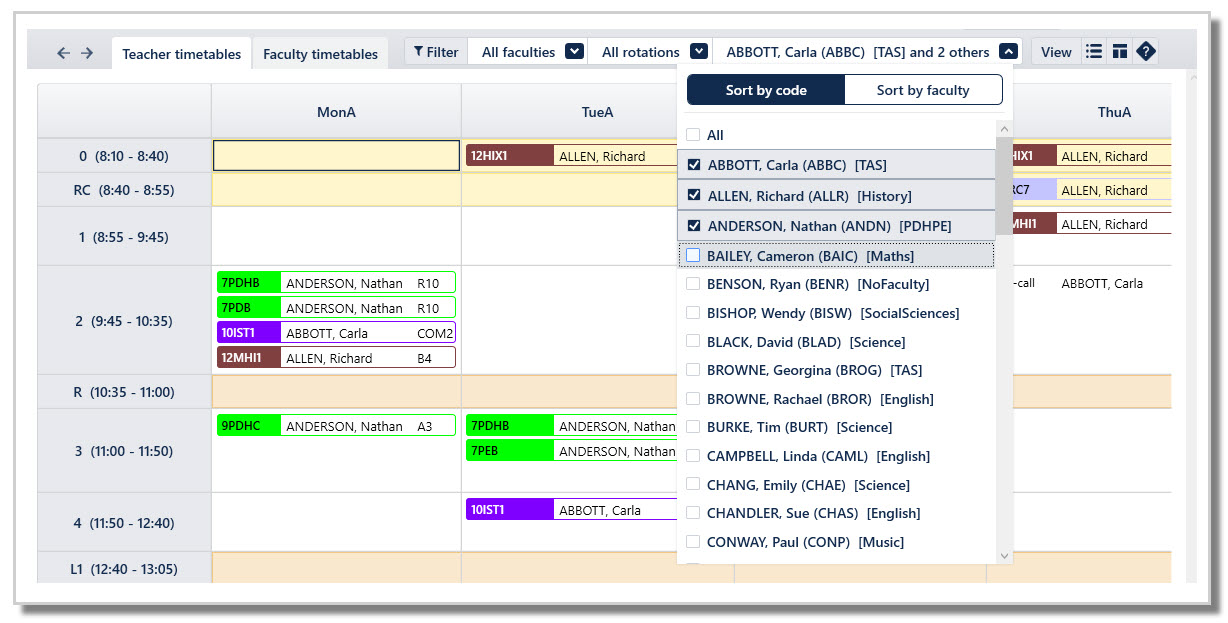 View single or multiple teacher timetables, by a single rotation or for several rotations, by using the filters at the top-right.