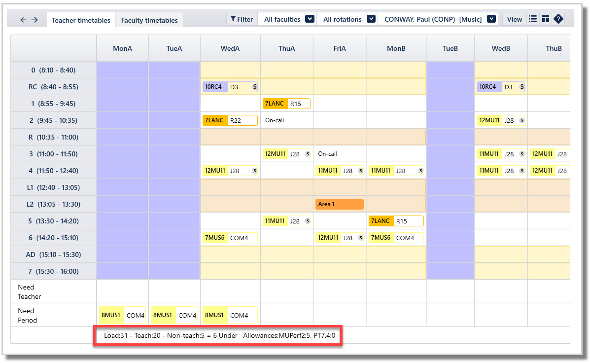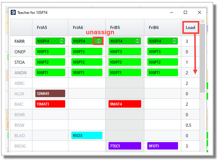 ‘Load’ (MaxLoad) less ‘Teach’ (allocated classes) less ‘Non-teach’ (includes Allowances and Meetings) equals periods remaining/underloaded.