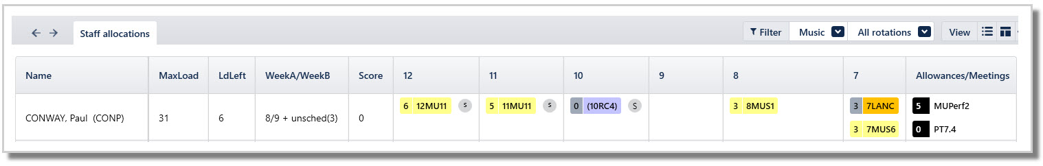 The corresponding Staff allocations (F4) display for this teacher shows the breakdown of their load: