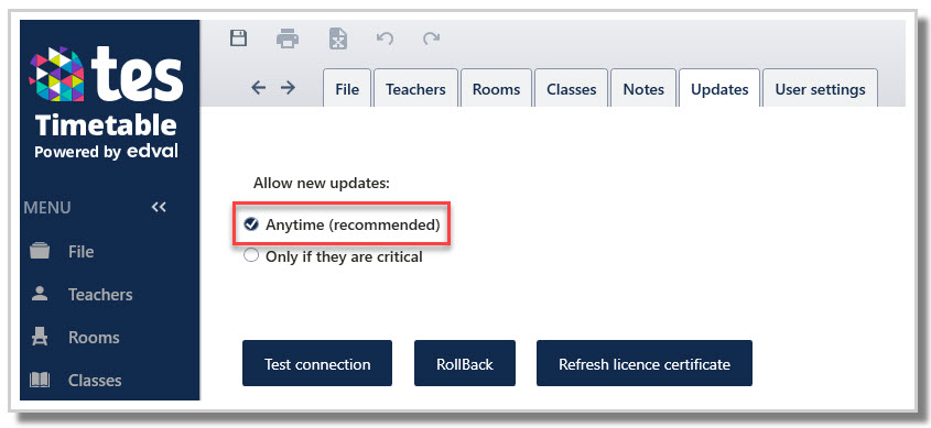 Anytime (recommended) - Tes will update to the latest version when it detects a new version is available. We recommend this as it ensures the latest version with fixes and new features is available.