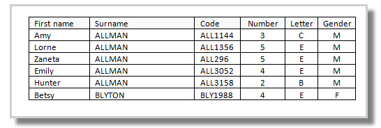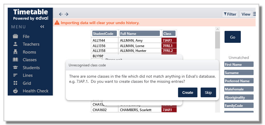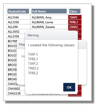 The following example is where student data, code and name already exists in the .etz file, and class codes are being added to the existing data.
