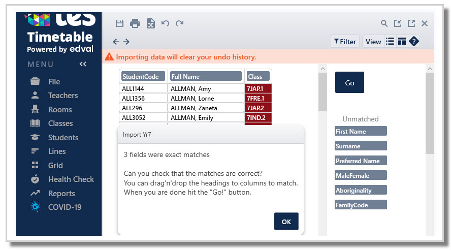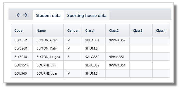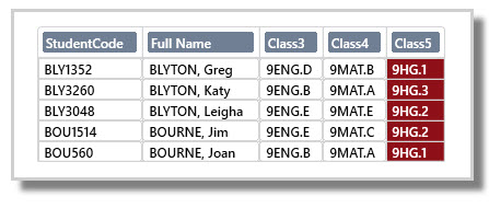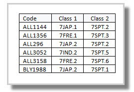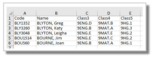 This image shows that students are already enrolled in some classes. If we were importing additional classes to these, we must not select the Class1 or Class2 headings at the import stage, as even a merge would overwrite these existing classes.