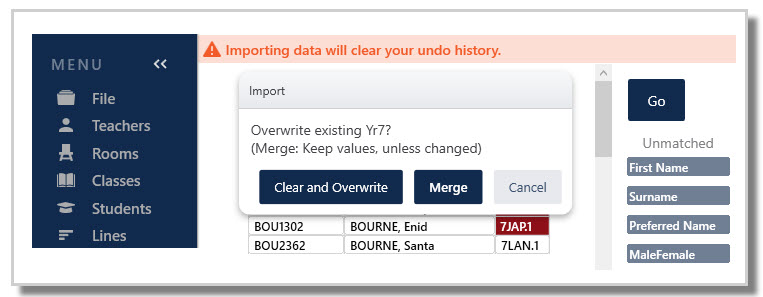 Clear and Overwrite: Will replace all existing data for the chosen year level with the incoming data.Merge: Will check for new data in the spreadsheet and add this data to the existing student data.