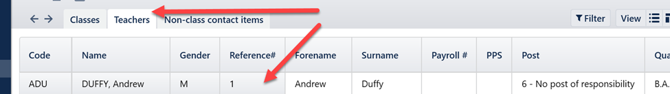 This is the table with potentially the most amount of work to do. If you can import last year’s B file (see above), that will reduce the amount of detail you need to enter about all of your staff who were at the school last year. The code, Name, Gender and Reference# are being read from Teachers > Teacher data (in the case of the Reference#, it is using the Admin ID column [remember View if you can’t currently see that]), so make sure that they are correct over there.