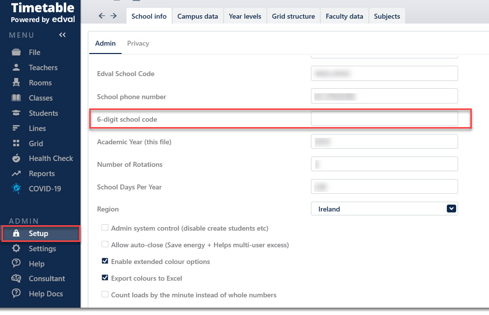 Make sure that your six-character school code is displaying correctly. Please go to Setup > School info > Admin.