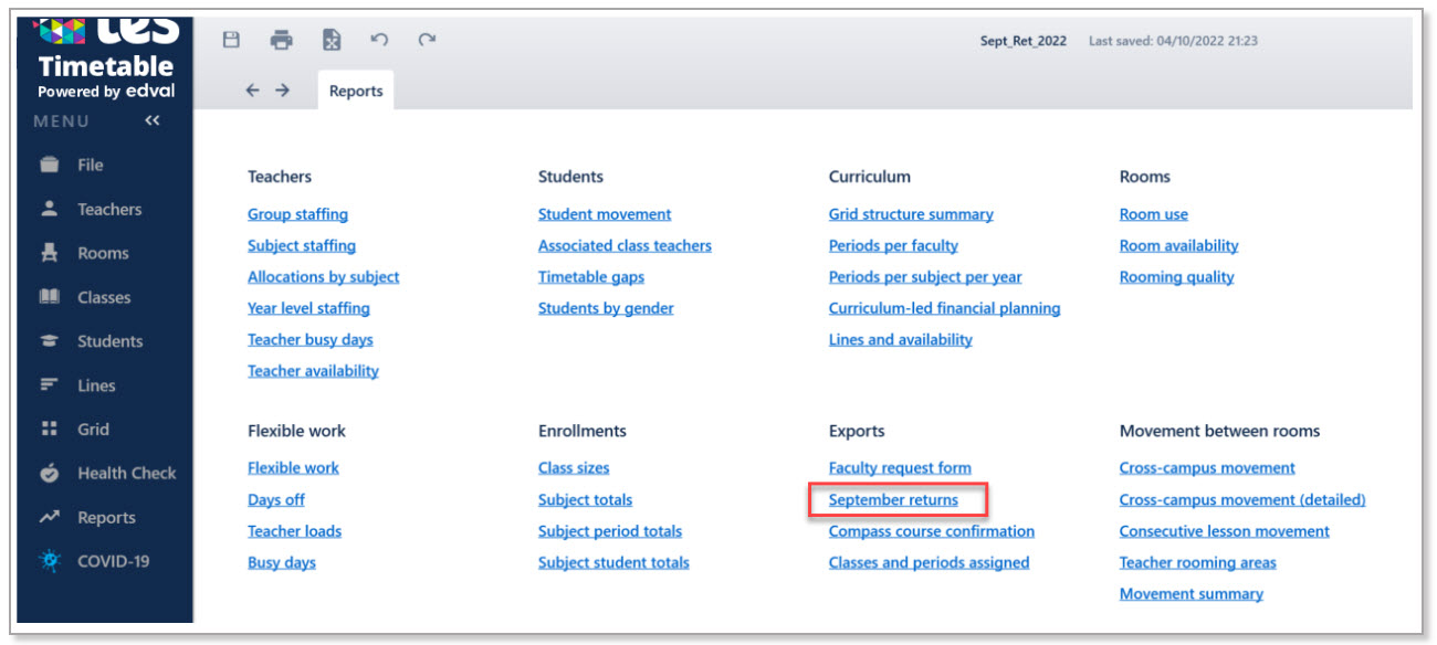 For this reason we suggest that once the timetable is complete (it does not need to be fully roomed, it does not need every single student attached to the correct classes) a copy of the etz is made solely for the purpose of completing the September Returns (deleting the sync Configuration information in this file would then make it impossible for a sync to Compass to then happen accidentally).