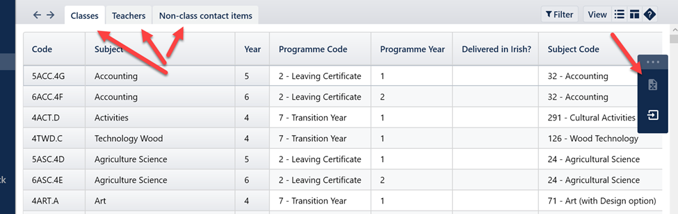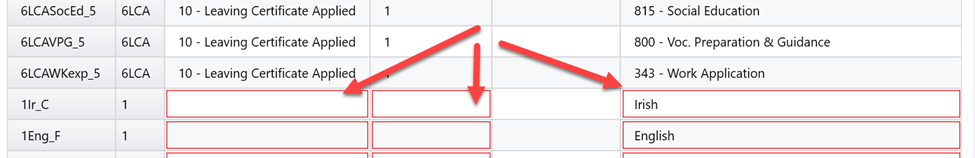This table will read information from Classes > Class data, in particular the Class codes and Subjects. If it feels able, it might take educated guesses at the Programme Code, Programme year and Subject code. If not, they will be outlined in red as requiring attention: