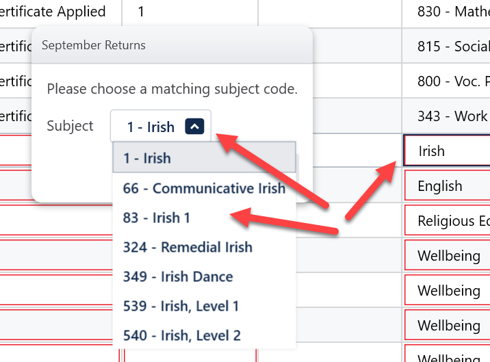 If you are not 100% sure about the subject code, try entering something close to the title. In this case, typing Irish and hitting enter gives these possible solutions from the official list: