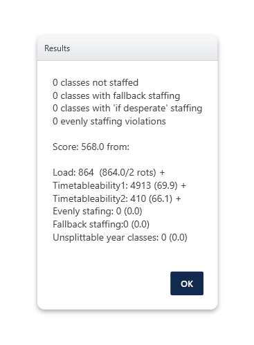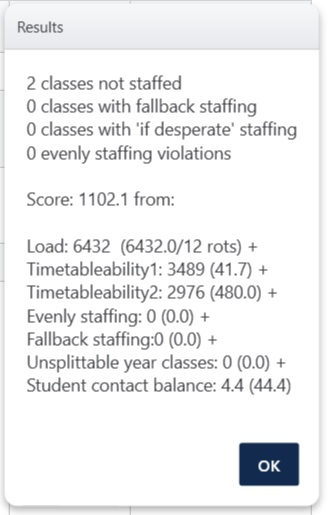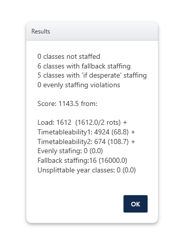 A results pop-up will appear showing how good the solution found is, based on the weightings. If all classes cannot be staffed, analyse which classes they are and why they cannot be staffed. It could be that more teachers are required, or more teachers added to Teachers > Subject teachers.