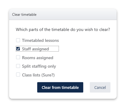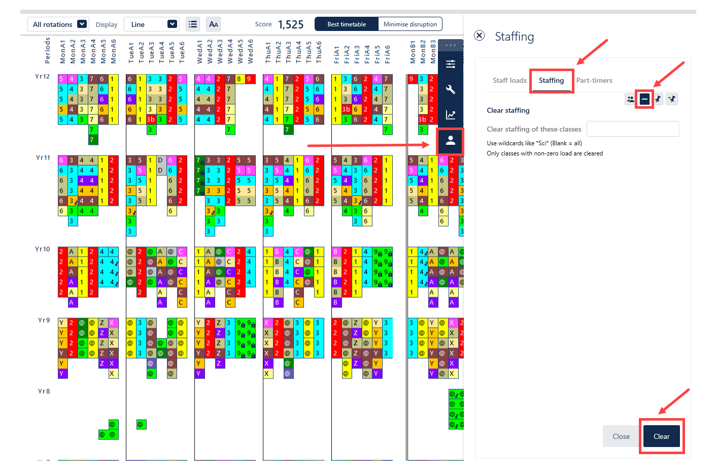 The staffing solution may be cleared by going to Grid > Clear timetable > Save/Backup/Continue > tick: Staff assigned > Clear from timetable;
