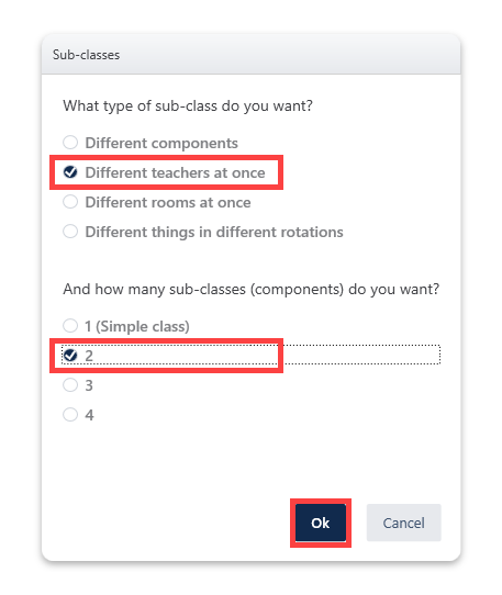 - In the Sub-classes window, select 'Different teachers at once' > '2' > hit 'OK'
