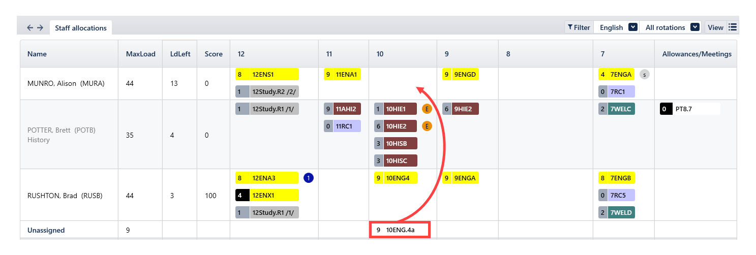 - Go to Teachers > Staff allocations (F4), filter by the English faculty, and find the sub-class in the Unassigned row.