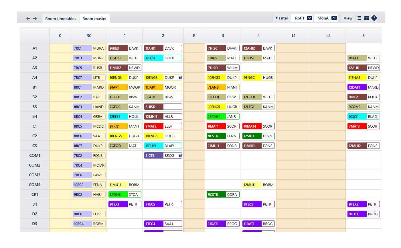 The timetable views options and functionality for the Room master work similarly to Rooms > Timetables.
