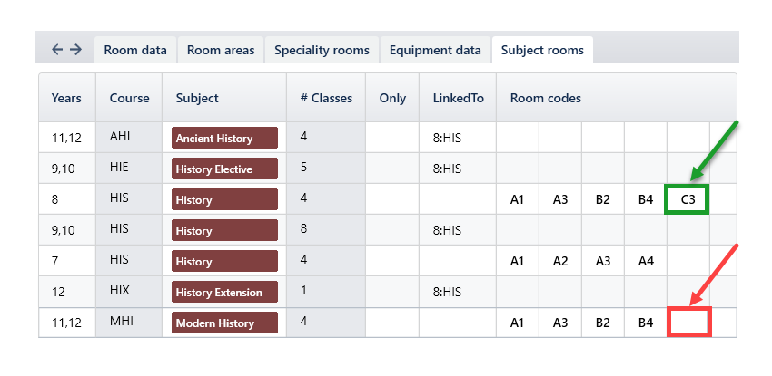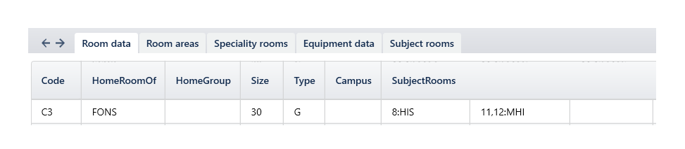 After adding C3 to the Subject room set for 11,12:MHI, the room set also appeared in the SubjectRooms column in Room data (F5).