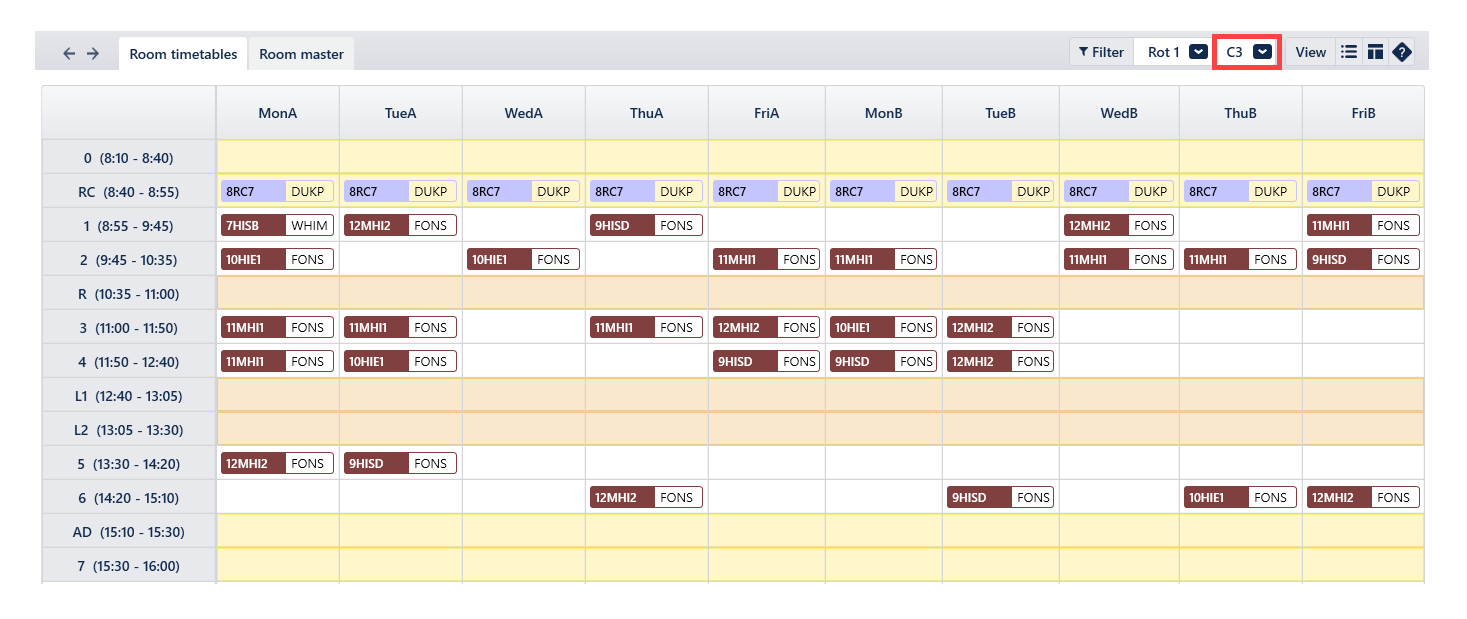 After auto-rooming all classes are allocated to C3. Rooms > Timetables.