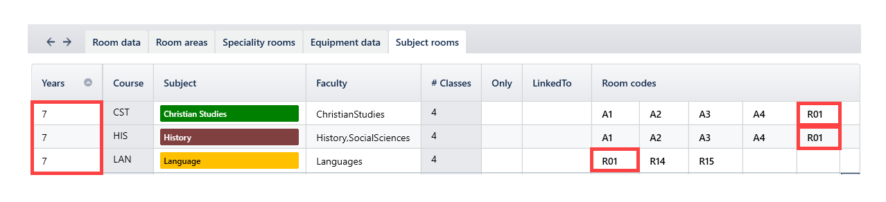 R01 is included in the room set for each subject associated with the Group 7A classes.