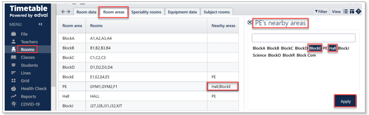 Nearby areas | Double click in the cell to open a pop up to select the nearby area/s for a specific room area, e.g., PE is a nearby area to BlockE and Hall. |