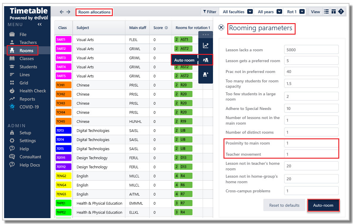 The auto - room algorithm considers the room areas and nearby rooms stipulated via the weights for 'Proximity to main room' and 'Teacher movement' as set in Rooms > Room allocations > Rooming parameters to assign rooms more effectively.