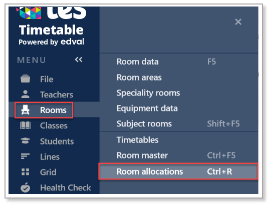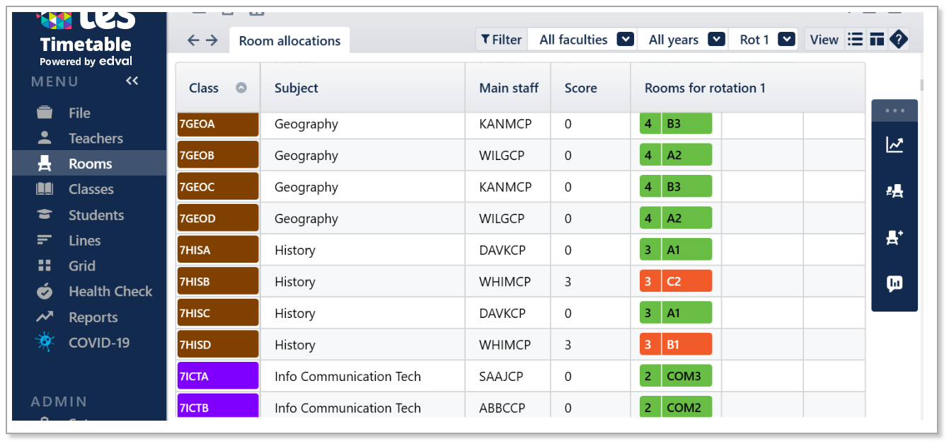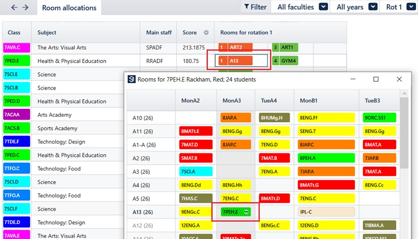 This screen shows all classes in a rotation that need a room, along with the room/s that they have been allocated.