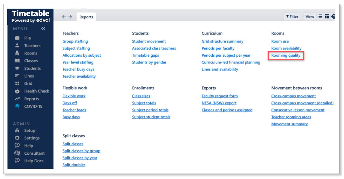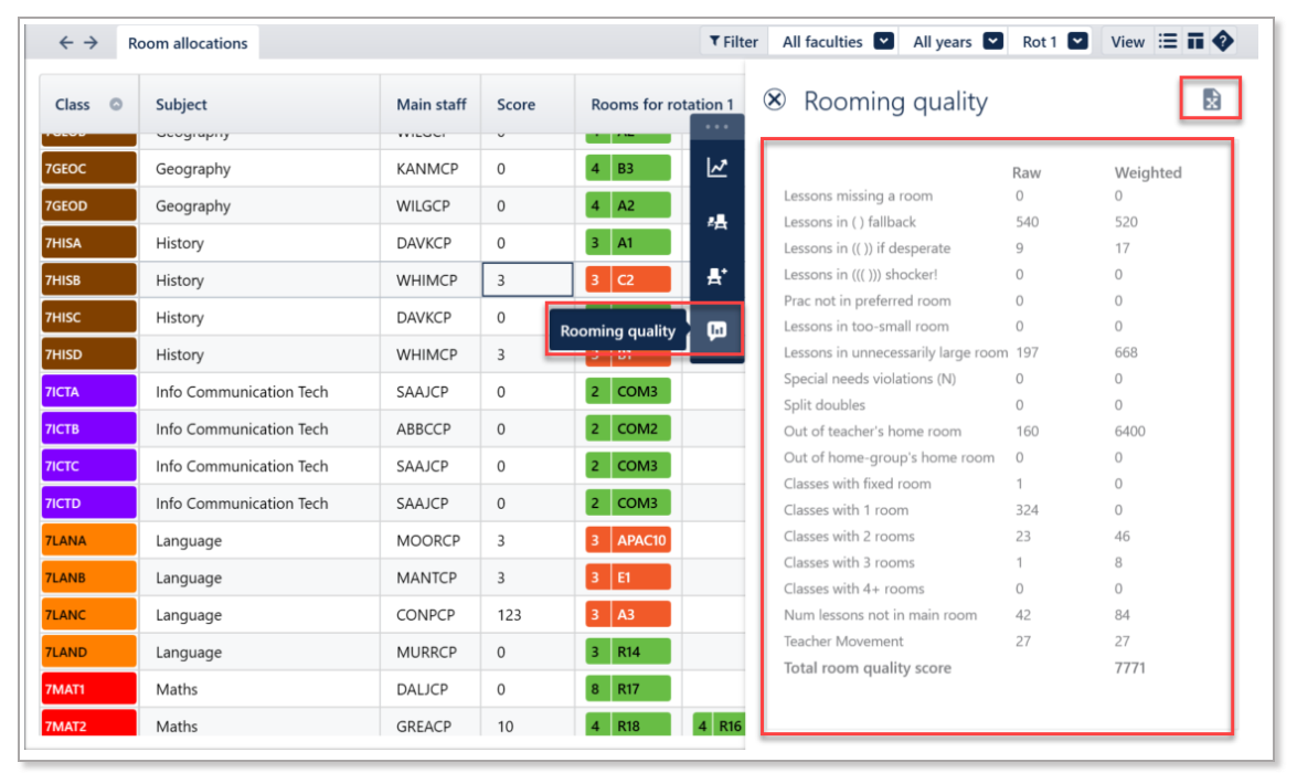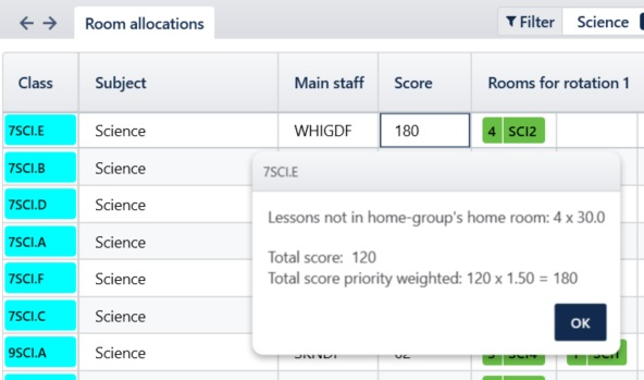 The list is sorted by default by the score. Classes with the highest penalty rooming scores, due to clashes, non-preferred rooms and poor continuity, sort to the top, as these are more important to analyse.
