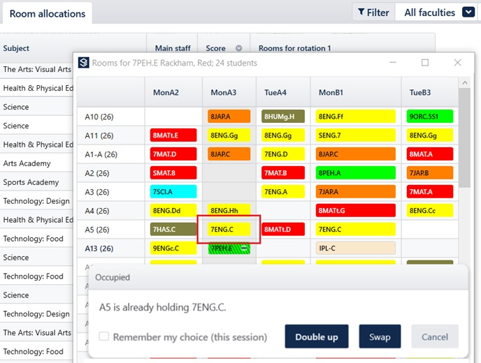 If you click on a room that is already assigned to another class, you will be prompted as to whether you wish to 'Double up', 'Swap' or Cancel.