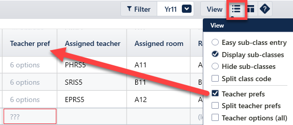 With the option Teacher prefs selected, only the 'Teacher pref' column will appear