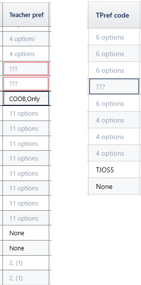 With the options Teacher prefs and Split teacher prefs selected, both the 'TPref code' and 'TPref rule' columns will appear.