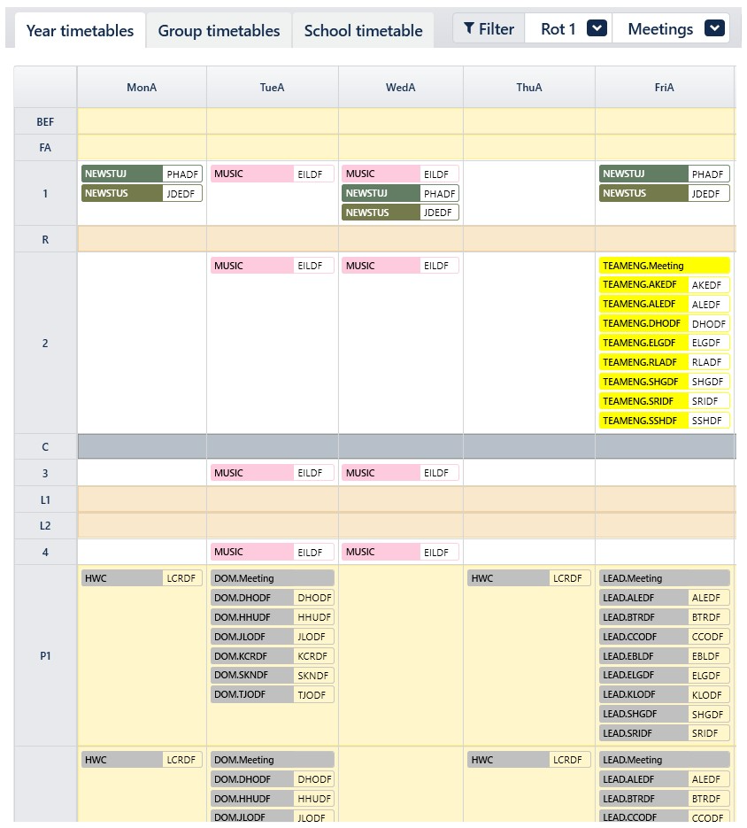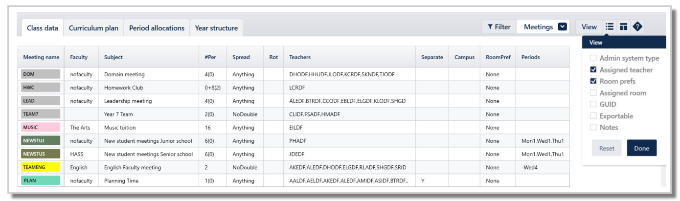 Meetings can be added to the grid manually, either before or after a timetable has been built, or alternatively, E10 can find a place for the meetings during the construction process.