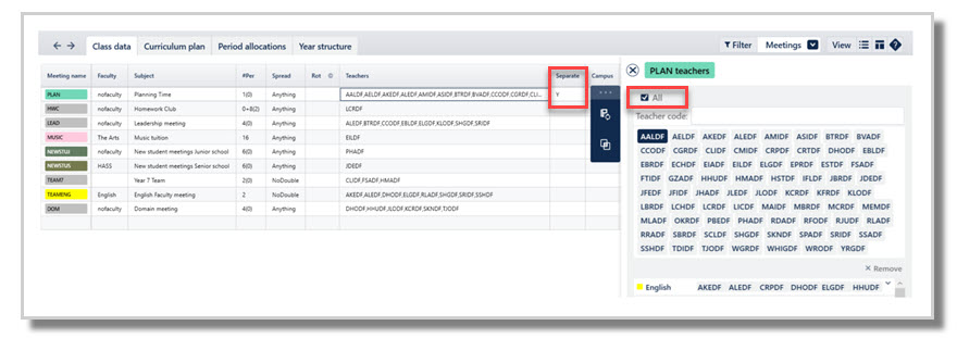 - Separate: Enter Y where there are multiple teachers who will be assigned to the meeting, but where the meeting does not need to occur at the same time for all teachers. For example, all teachers may need to have one period of planning time, but they can each have it in a different grid spot to suit their own timetable.