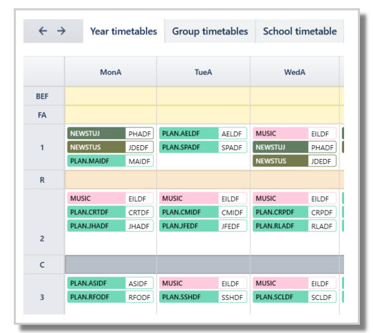 - ThuB1-B4 = Occurs on Thursday in B week in periods 1 to 4. (This may include offline periods such as Recess.)
