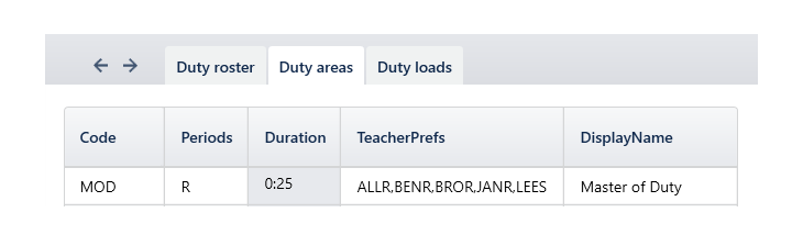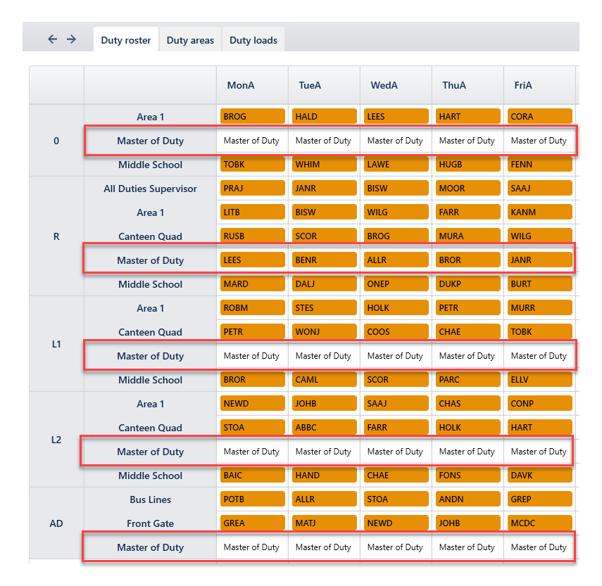 Some schools elect to have the MOD duty area as only EVER one duty slot, such as Recess, as this is known internally to all that the MOD is a whole day assignment. As such, it can be regarded as roster spam to list them against every single duty period, when everyone knows it is 'always the same' teacher. This approach is quite good if these teachers never (or rarely) take regular duties as a cover, as they could be assigned an L1 cover duty, on a day where they are MOD, and thus needed for MOD duties at the same time. Even in this case, it may not actually be regarded as a clash, as the supervisor may elect to cover the L1 duty area themselves, while 'also' doing the rounds to check other areas. It may be reduced coverage, but not pose a major problem if not a regular event. Technically, you can also mark MOD teachers as having preferred unavailability on duty periods other than R, as an alternative to ensuring they are not assigned regular duties unless really needed, and not assigned covers of regular duties unless again, really needed.
