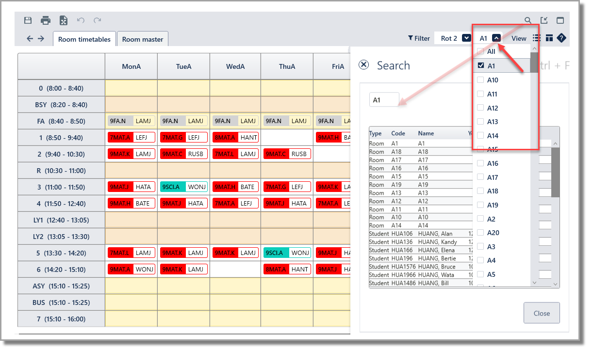 Select the room from the toolbar drop-down list, or type the room code or name (or part thereof) into the ‘Search’ box.
