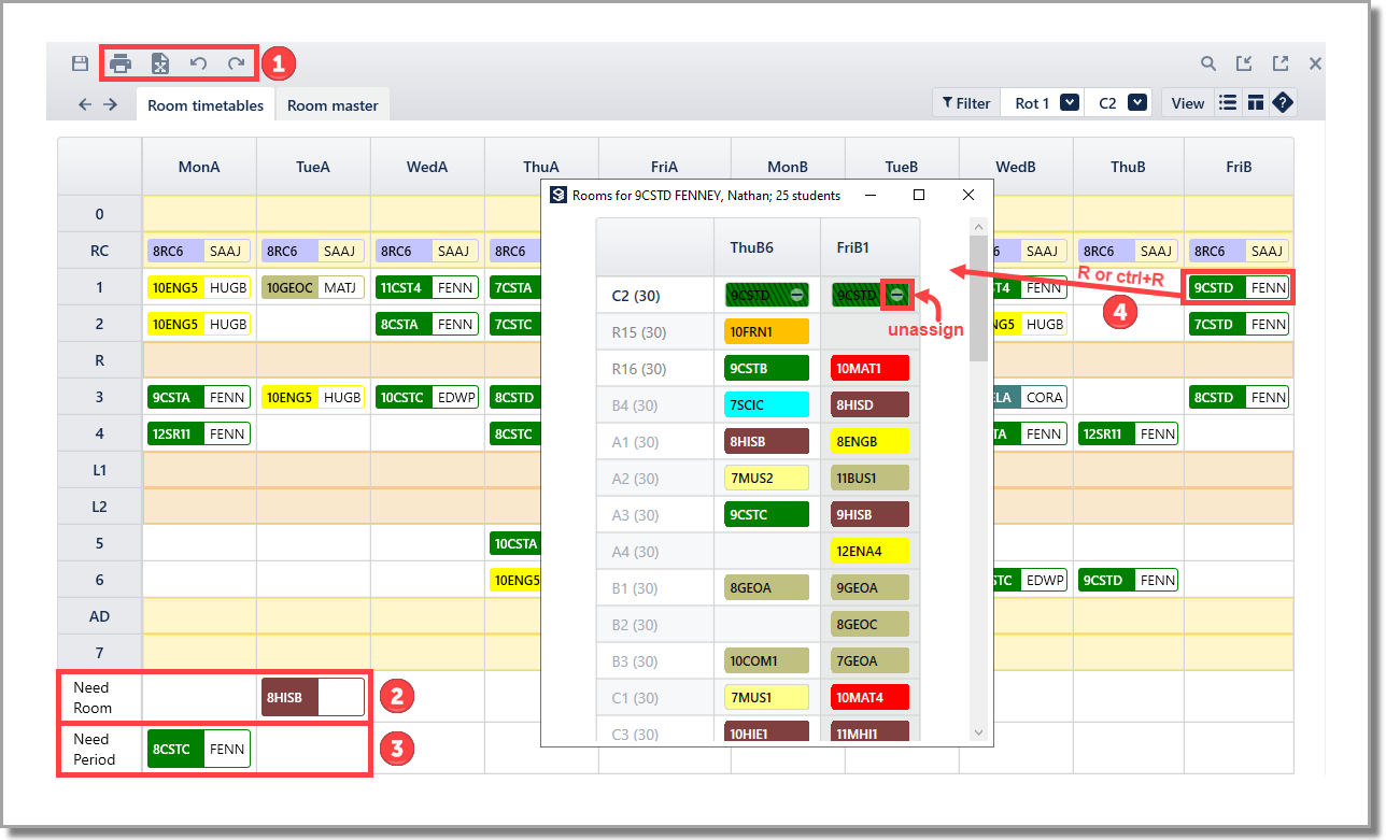 Shown by coloured circles on the relevant cells of the table, indicating where a teacher, room, class, student or other is being requested in two places at the one time, or where classes have been placed in rooms where there are not enough seats.