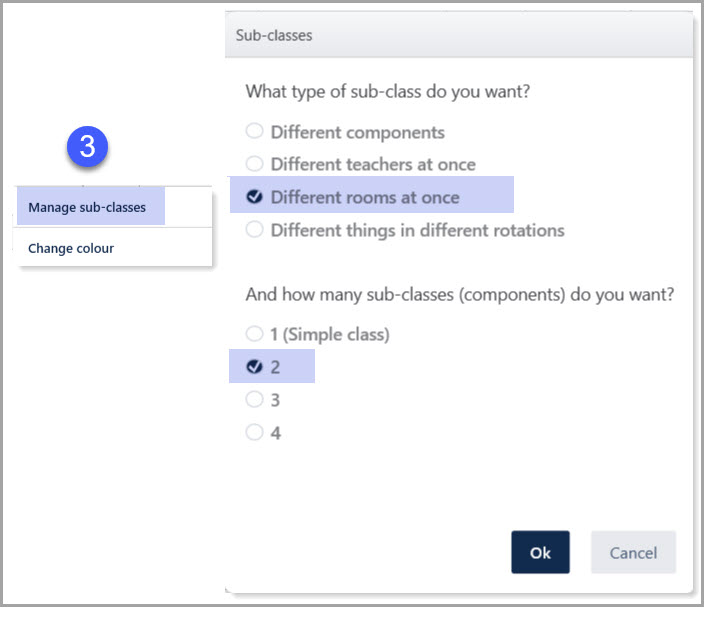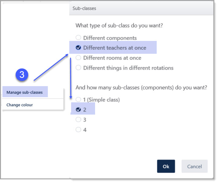 - Right-click on the class code, select 'manage sub-classes', 'proceed' and then select 'Different teachers at once' and '2'.