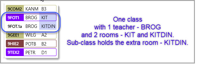 Sub-classes can be used to change resources in different rotations, or to assign different teachers or rooms, such as splitting a when class into theory and practical components. See following articles more more details