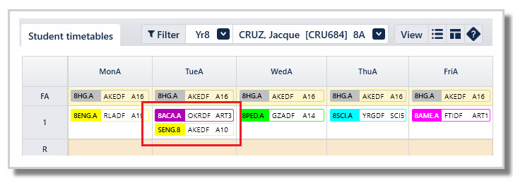We can allow both classes to show on their timetable, or, E10 allows us to specify which subjects should take priority on their timetable.