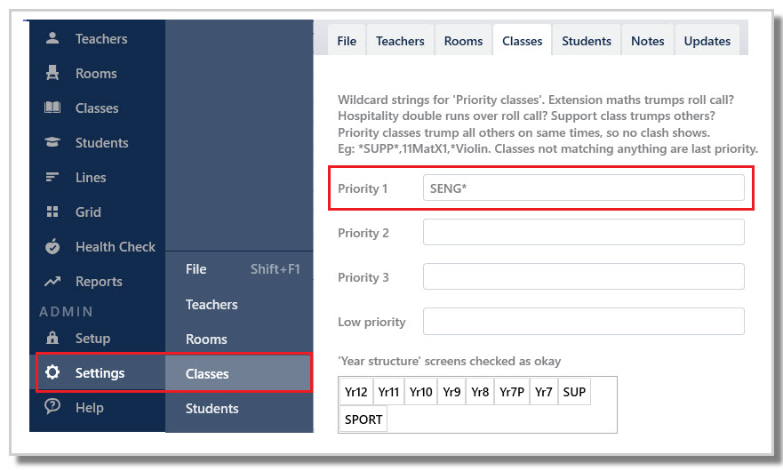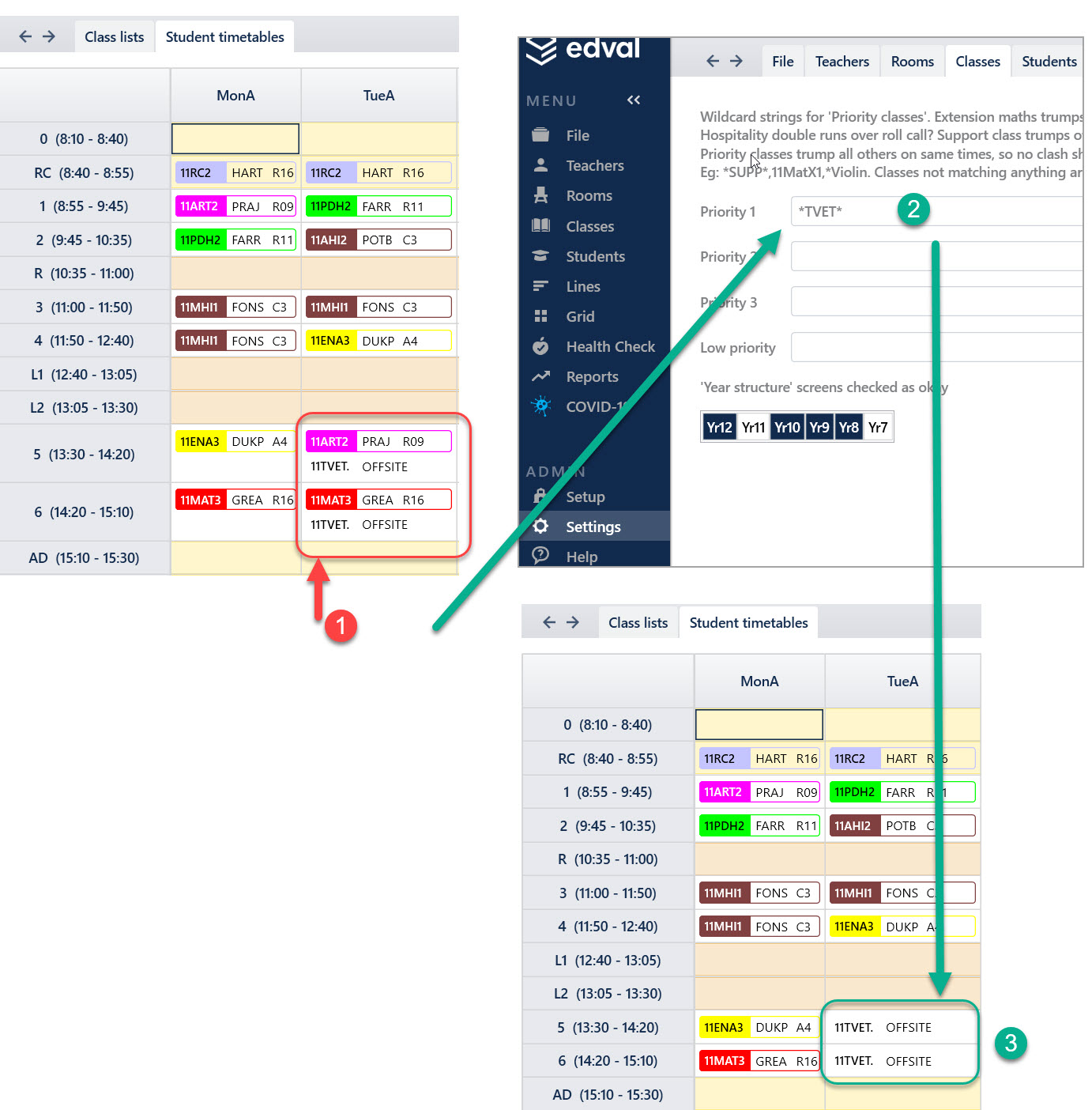 Not all external systems understand E10's priority class feature. If you sync the timetable to an external system, log in and check the student's timetable to see whether the priority class only shows or if both classes show, and consider how this will affect roll marking.