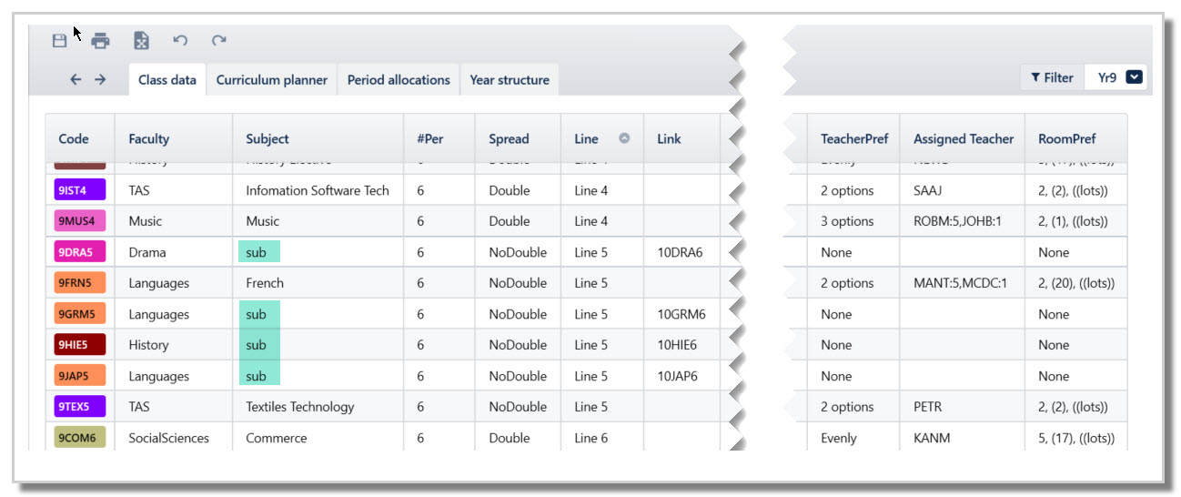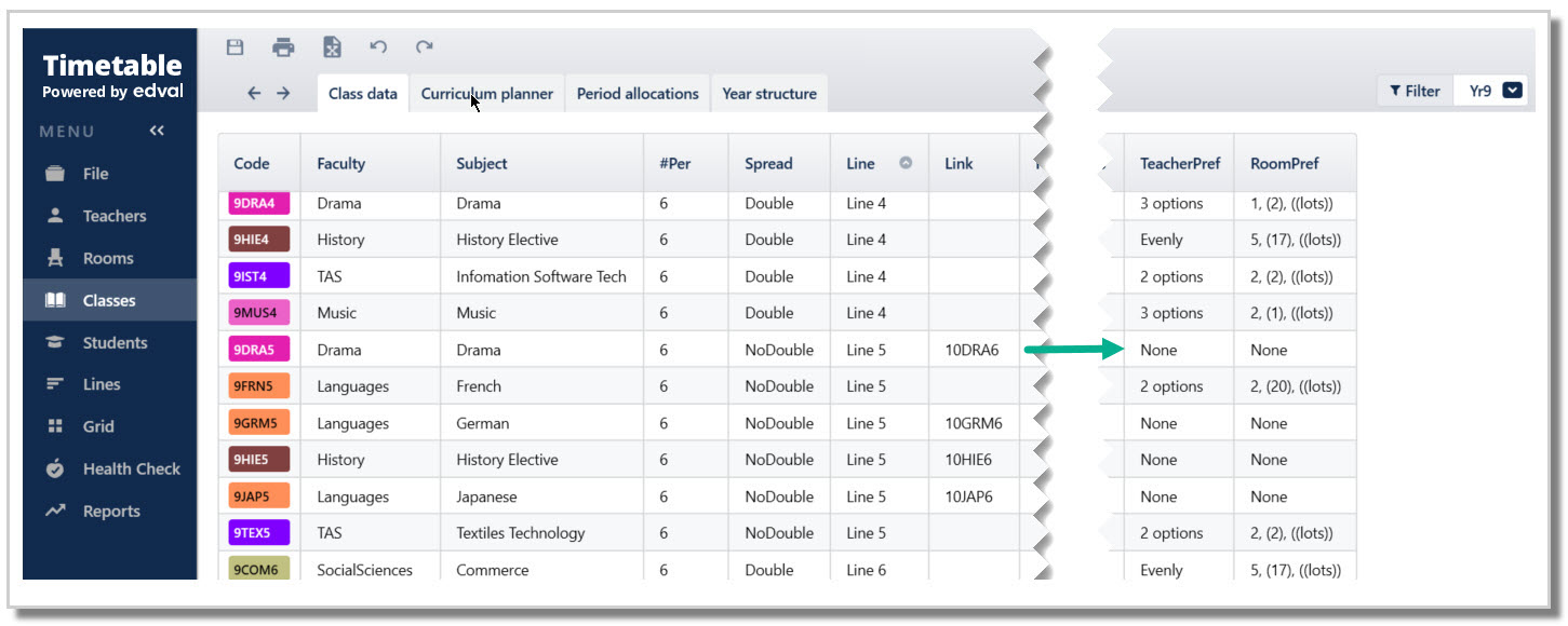 In this example the Year 9 Line 5 classes are linked to the Year 10 Line 6 classes creating composite elective classes. The French and Textiles Technology classes are stand-alone classes so are not vertically linked.