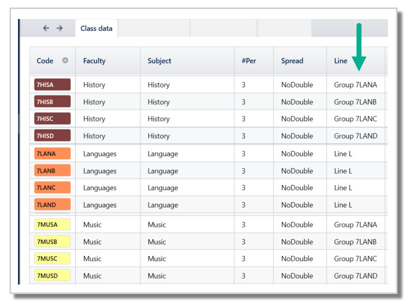 - Code each Music class as ‘Group 7LAN…’ , in the Line column, to group with its corresponding Language class. e.g.