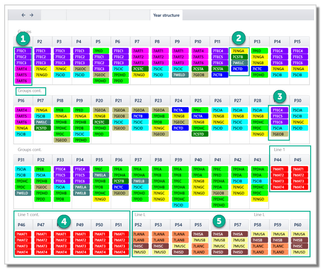 - Greatly reduced flexibility. Subjects have far fewer periods to move around in if they are forced to be grouped independently in this manner. For instance in the example following, 7MUSA has 3 periods with only 9 possible options. If the MUS, LAN and HIS classes were included in the 7A Letter group there would be 43 periods as possible options.