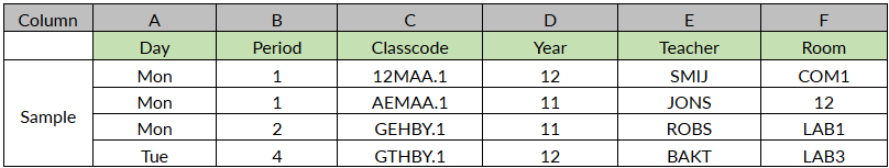 Generic Data Requirements | Excel / CSV / Word | If data can be extracted from your current timetable, please use the examples below as a guide on how we need your data formatted. You can also use the attached templates to provide us with your Teacher data, Student data, Class data and Room data. It is common for schools to submit Excel, .csv and Word documents as part of their timetable data, so please submit any documentation you feel is relevant, and we may ask for further information if required. |