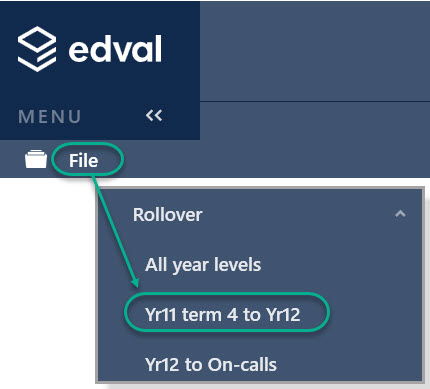 1. File > Rollover next year > Yr11 term 4 to Yr12