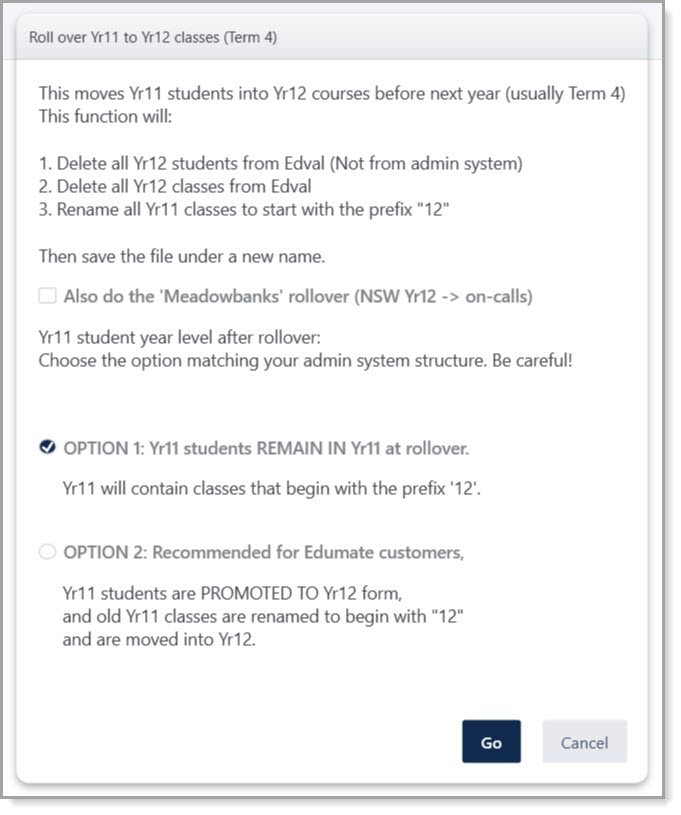 Year 12 class data will be removed from the file. Year 11 classes will remain in the Year 11, but the prefix will be changed to '12'