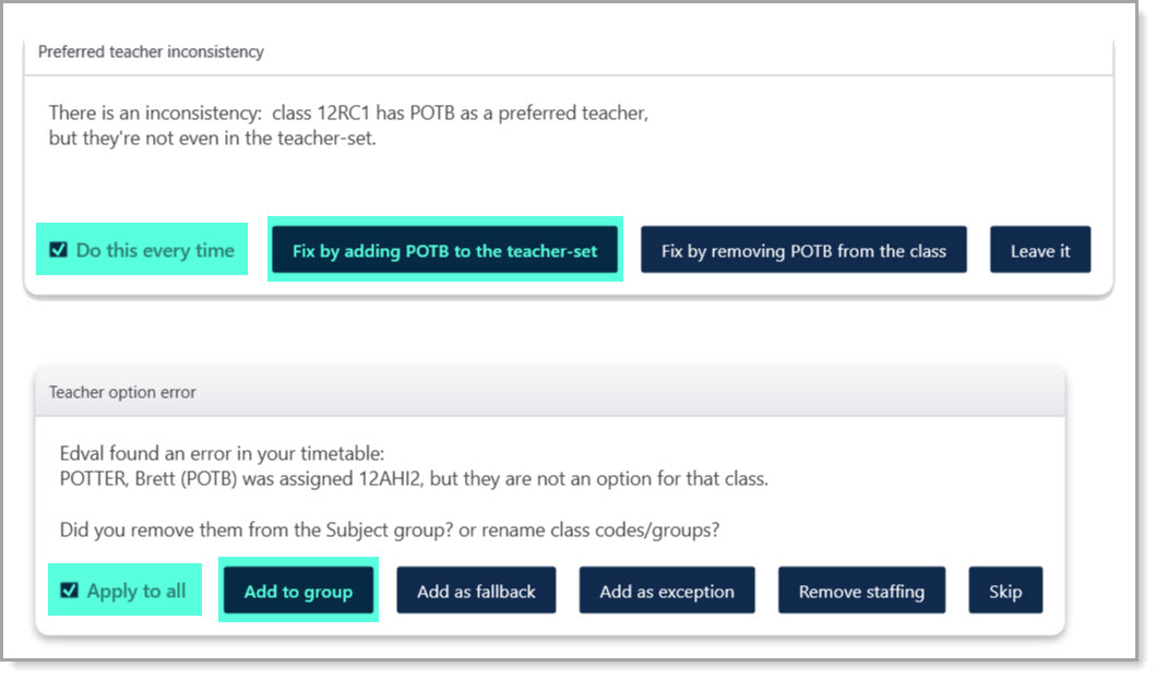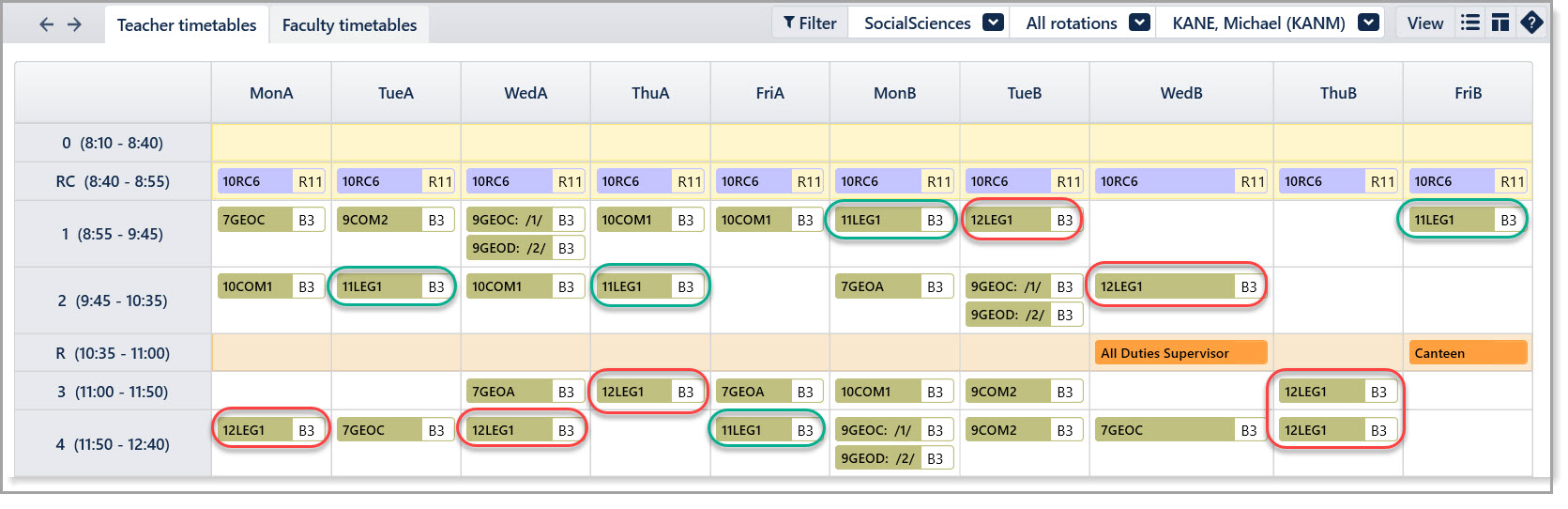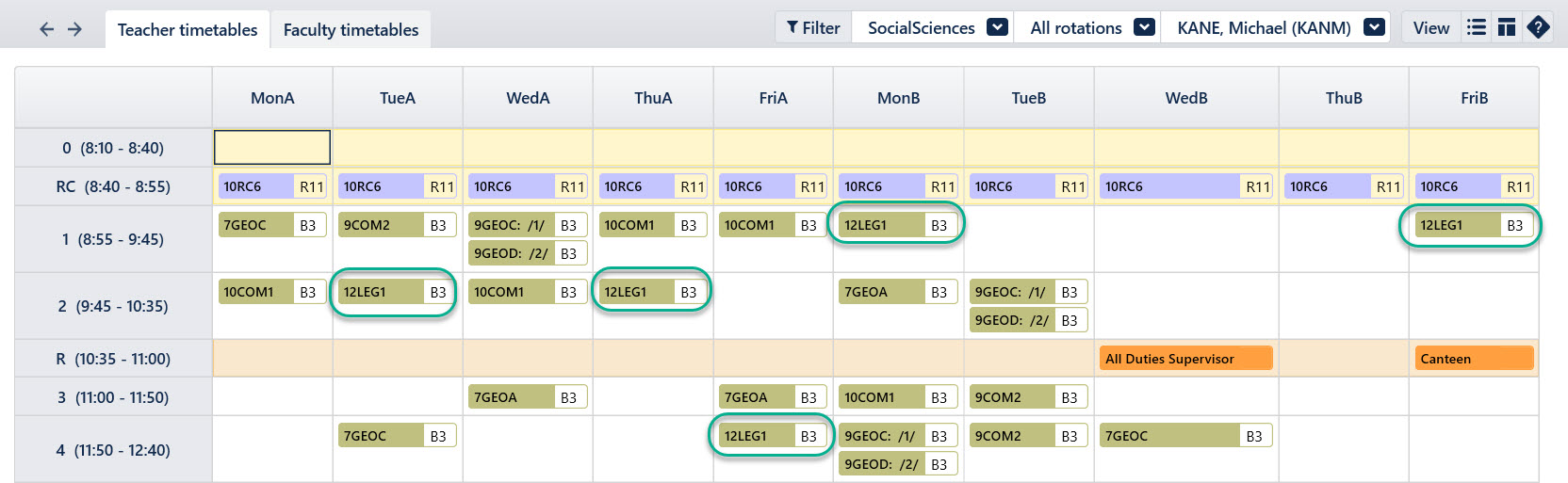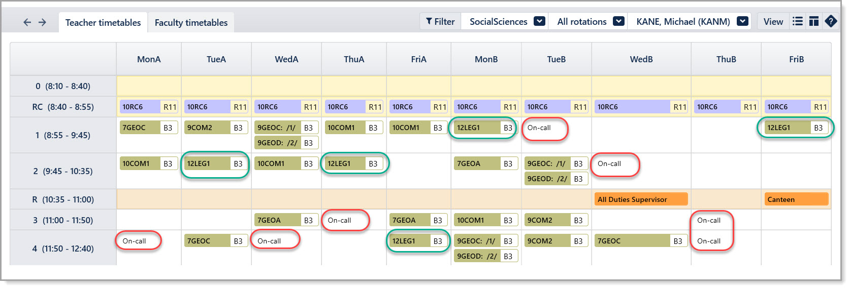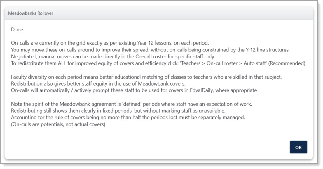 This option caters to the scenario common in NSW schools in which year 12 teachers are made available for in lieu classes, or 'Meadowbanks'. When this option is selected, Year 12 teachers will be placed on the E10 On-call roster on the periods in which they previously had a Year 12 class.