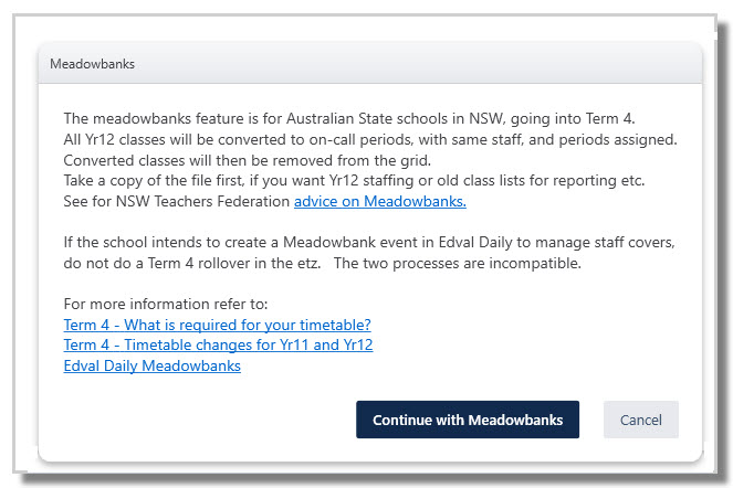 - A 'Meadowbank' roster can be created in Daily without making any changes to the etz file.
