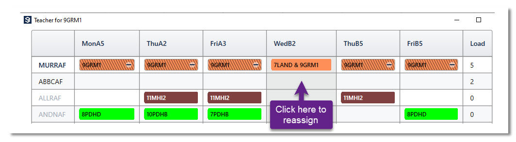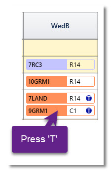 1. In a teacher's timetable, left-click on the period of the class to be allocated to a different teacher. Hit the letter ‘T’ on the keyboard.