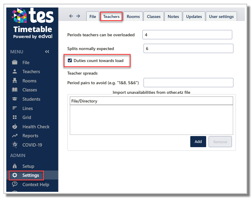 To enable duty allocations to be counted in the calculation of teaching loads, go to Settings > Teachers and select "Duties count towards load".