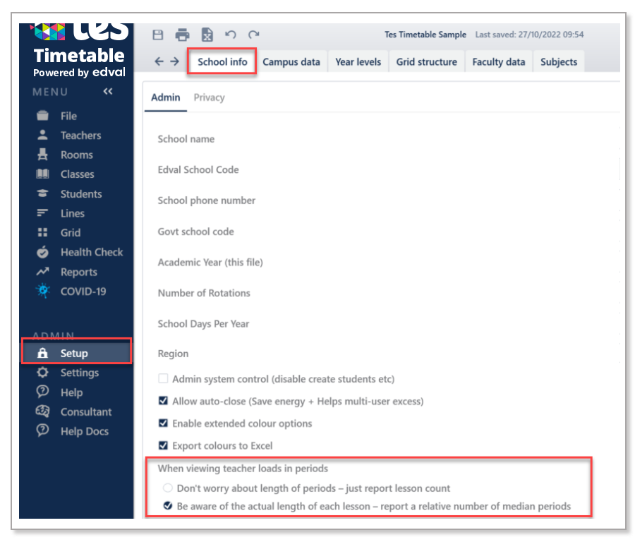 In order for loads to be calculated correctly, there is an important setting that needs to be enabled for viewing loads in periods. In Setup > School info there is a checkbox that needs to be selected so that E10 calculates and displays duty loads with respect to the median length of teaching periods, as set up in the grid structure. Please ensure that this setting is selected as shown below.