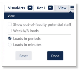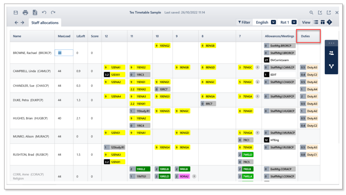 When the option to include duty allocations in loads is enabled, a new column titled 'Duties' will appear in Staff Allocations. This will be populated with the duties that have been allocated to each teacher via the Duty Roster.