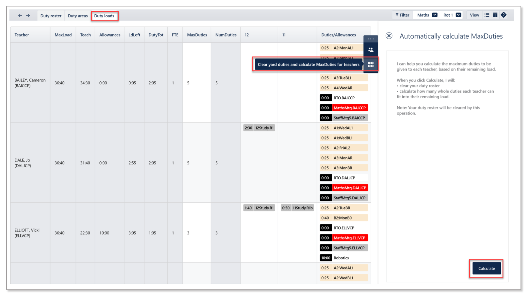 Important note: The maximum number of duties per teacher is calculated based on the median length duty period. This may result in some teachers exceeding their maximum load allocation if they are assigned to duties that are longer than the median length. It is recommended, after automatically calculating maximum duties and generating the roster, that all allocations are checked and duty loads adjusted if the maximum load has been exceeded for any teacher.